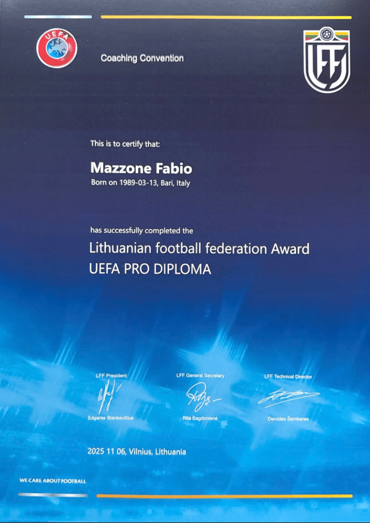 Scoutmania is proud to congratulate our CEO and Founder, Fabio Mazzone, on successfully obtaining the UEFA Pro Diploma, the highest coaching qualification in European football. Awarded by the Lithuanian Football Federation in Vilnius, this certification represents a significant professional milestone and reflects the elite standards we aim to uphold across every part of our organization.