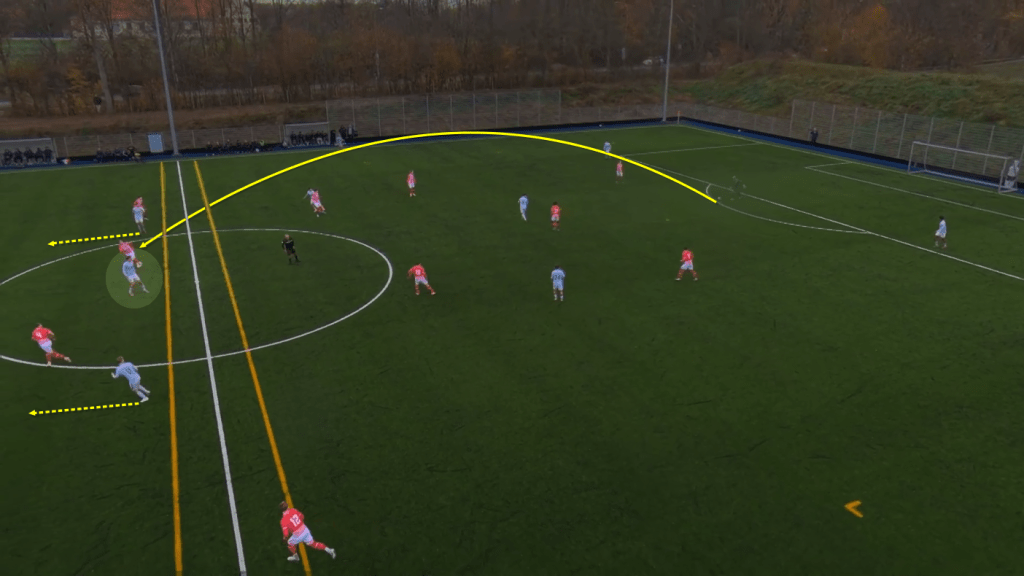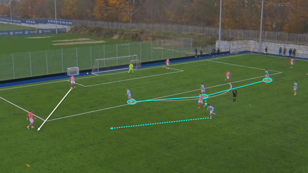 Out of possession they ‘mirrored’ their opponents offensive shape by closing down the opposition central midfielder with their offensive midfielder and with their striker splitting the opposition centre-backs to force the play towards one side (see image below).