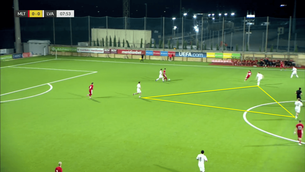 Latvia, coached in a 1-4-3-3 formation by the Czech manager Jakub Dovalil (who previously coached Czech Repubblic youth national teams), showed good mobility in midfield by interchanging positions to create space and receive the ball (see image below). Their midfielder Zaleiko also dropped often beside the centre-backs to get on the ball and play long passes to the full-backs running down the line.